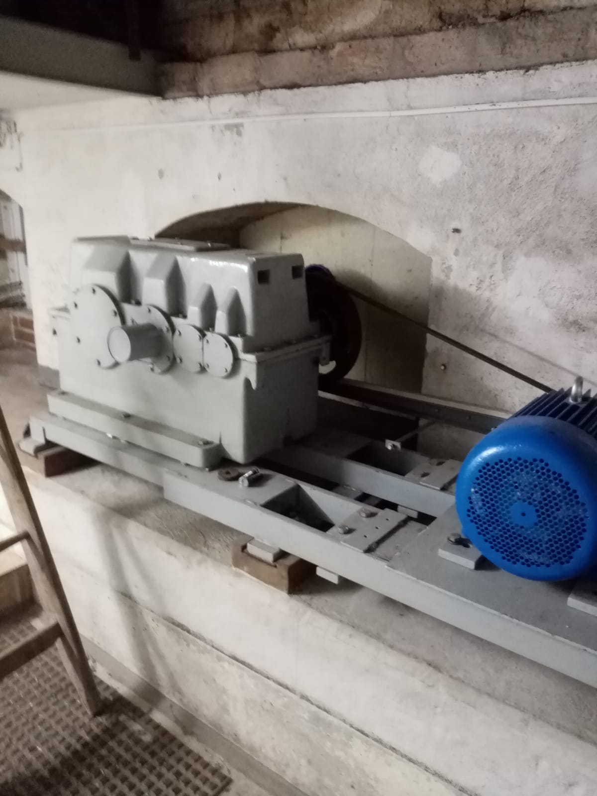 Diese Schieberplatte schließt und öffnet vollautomatisch, denn sie reguliert den Wasserstand im Obergraben. Zusätzlich ist sie mit einem Dahlanderantrieb ausgestattet, um bei drohender Hochwassergefahr eine kurze Verschlusszeit zu haben. Der Dahlanderantrieb besitzt 2 Geschwindigkeiten, mit der langsamen kann das Wehr quasi millimetergenau in der Höhe gesteuert werden, die schnelle dient zum schnellen Öffnen oder Schließen bei Havarien.