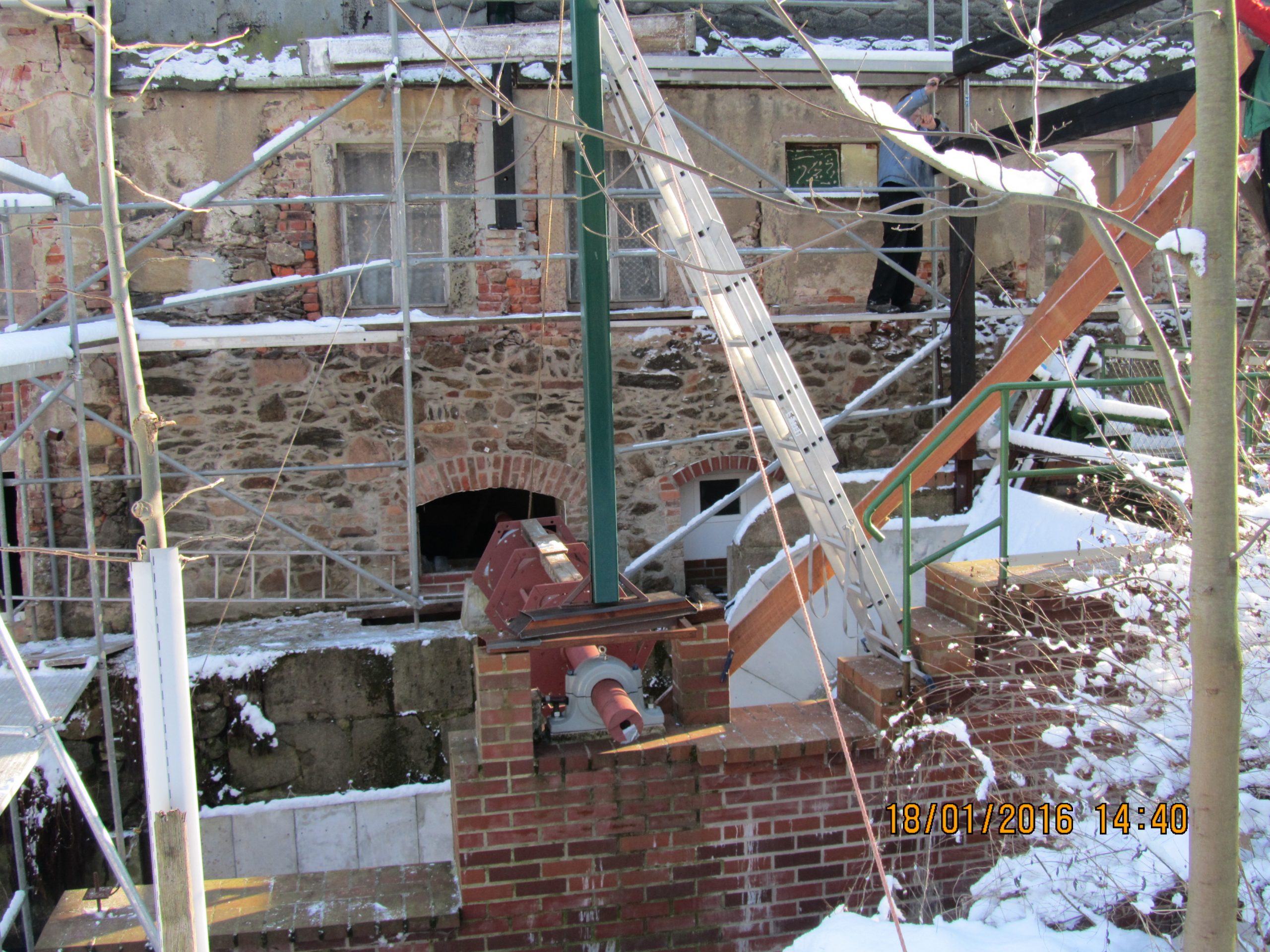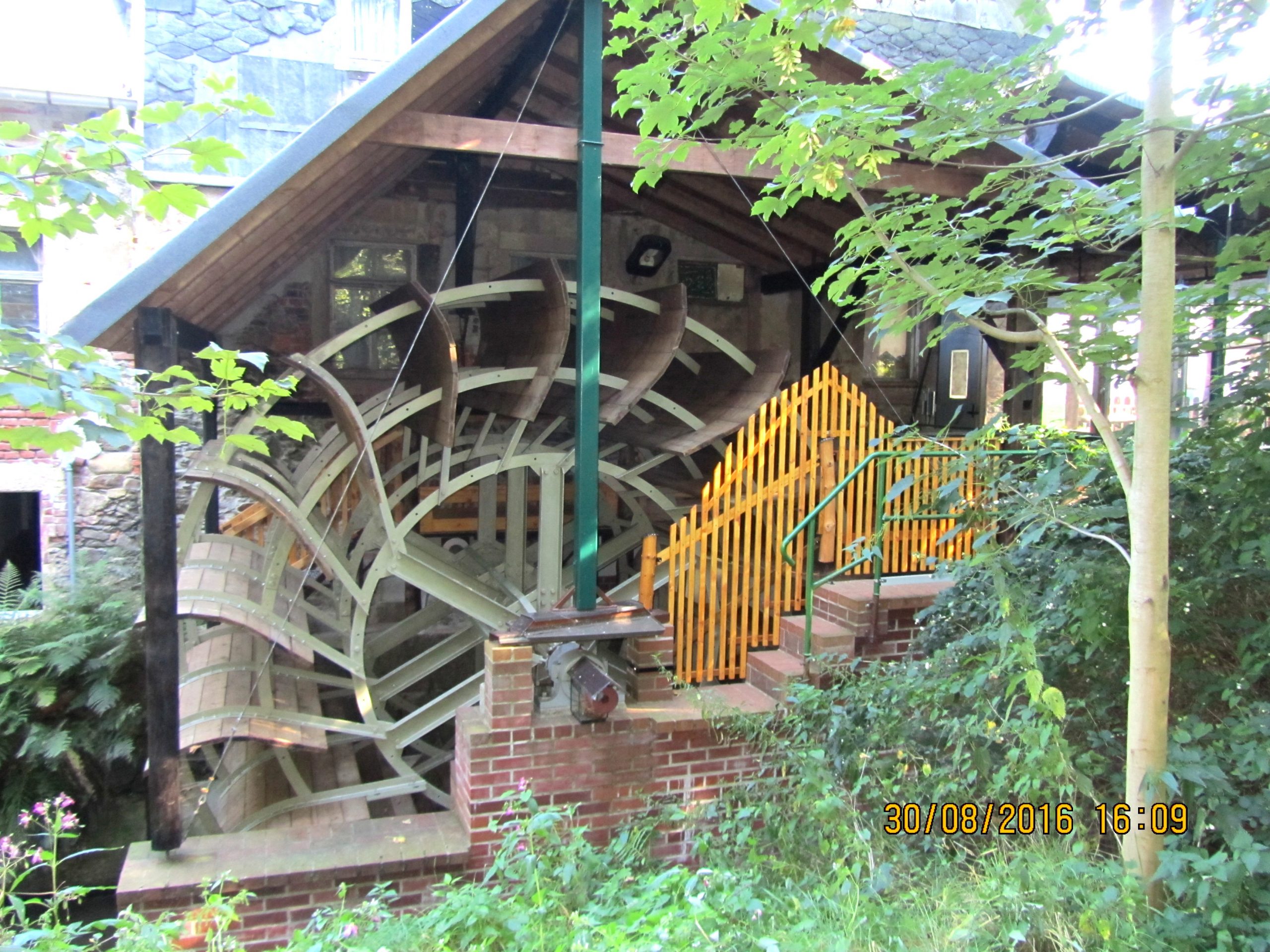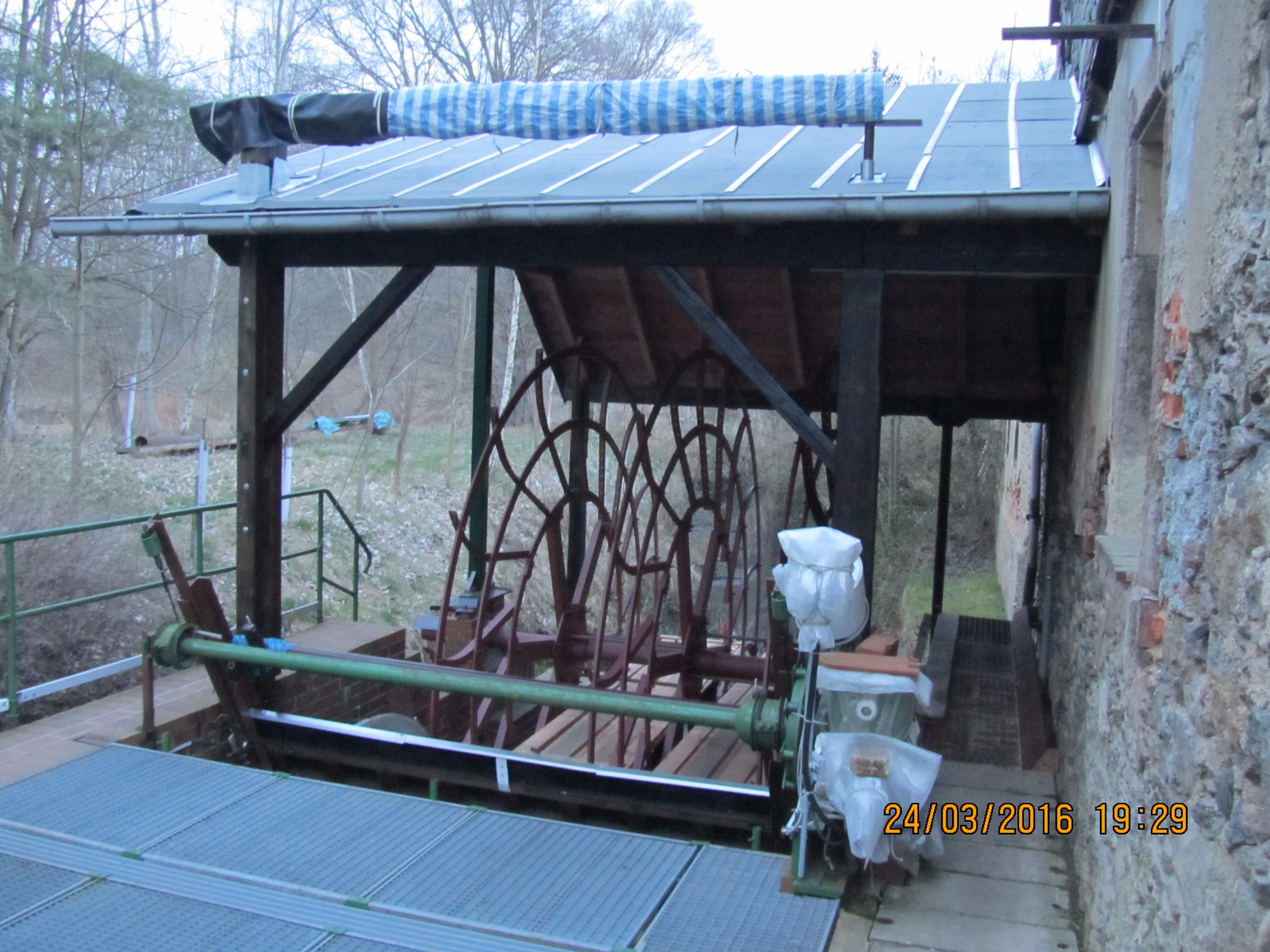 Balken von Abrisshäusern, Getriebe, Generator und Kleinteile vom Gebrauchtmaschinenhandel bilden die Grundlagen der Konstruktion. Besonders schwer war es, eine passende Wasserradwelle zu bekommen. Als Kompromiss verwendeten wir eine Welle mit 16 cm Durchmesser statt der geforderten 24 cm. Aus diesem Grund konnten am Rad nur 18 statt der geplanten 36 Schaufeln montiert werden. Auch muss der Lastabtrieb dadurch an beiden Seiten des Rades erfolgen, was wiederum dazu führt, das die Seitenansicht desselben verloren gegangen ist.